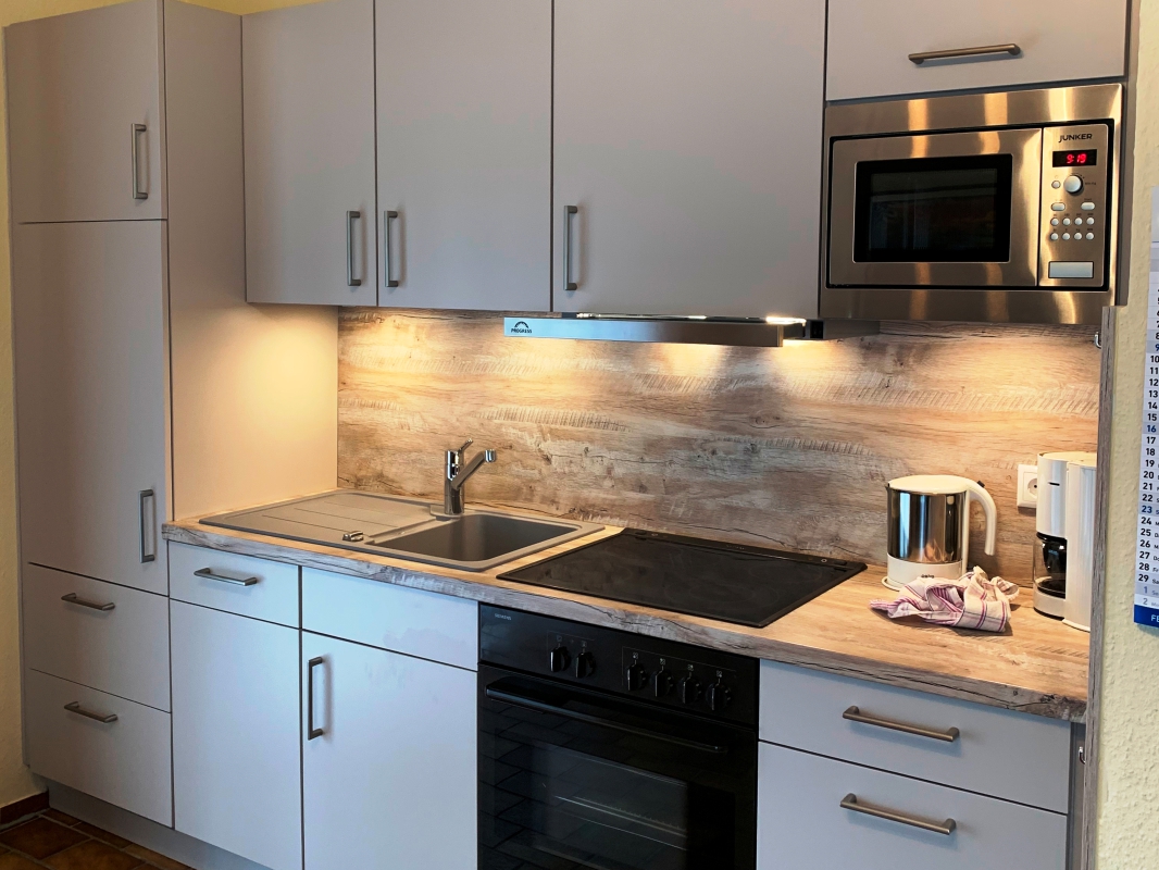 - Kleine Küchenzeile ausgestattet mit 2-Platten-Ceranfeld, Mikrowelle, Kühlschrank mit Gefrierteil, Spülmaschine, Kaffeemaschine, Toaster und Eierkocher